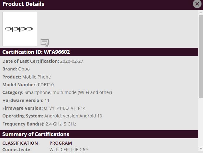 From the WFA Listing Oppo, Find X2 Models PDEM10 and PDET10 will come with the Android 10 os and Wi-Fi 6 connectivity and the Firmware version Number is Q_V1_P14 and it supports Dual Bands. Similarly, Find X2 Pro Model PDEM30 also gets certified in the WFA Listing with the same Android 10 os.