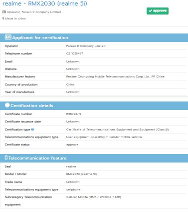 Realme new model RMX2030 has been certified in Thailand’s NBTC with name Realme 5i and  Wi-Fi agency with Android 9 pie. Earlier before it was certified in Indonesia’s TKDN and India’s BIS sites which were expected as  Realme X50 5G.