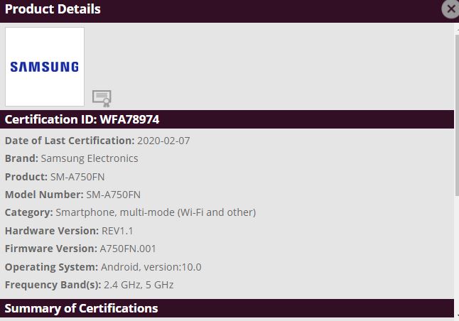The South Korea giant Samsung is going to release Android 10 (One UI 2.0) update to Galaxy A40, Galaxy A20e, A10, A10e and Galaxy A7(2018) as it gets certified in WFA Alliance.