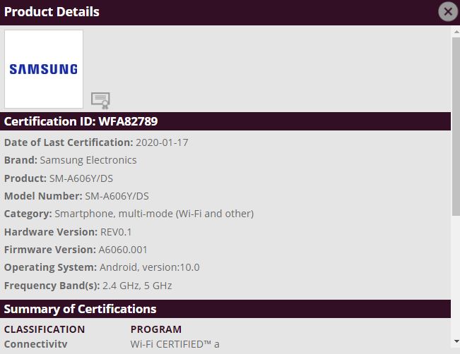From the WFA listing following Samsung Galaxy A60 models SM-A6060, SM-A606XC, and SM-A606Y/DS has been seen which means these variants will get Android 10 updates Soon and the Firmware version Num be for these is A6060.001 and support Dual Bands. According to the Samsung Android 10 RoadMap galaxy, A60 will get Android 10 in April 2020. Samsung Galaxy A40 was launched in 2019 with Android 9 pie and now it is going to get Android 10 update.