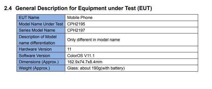 It has also confirmed that Oppo CPH2197 will sport a 6.4-inch Display, i.e., 162.9*74.7*8.4mm in dimensions and it weighs 190g (with battery). The Oppo CPH2195 is a 5G phone that supports dual bands 2.4G and 5G. It will launch with the latest ColorOSV11.1 based Android 11 and connectivity option includes Wi-Fi 802.11 a/b/g/n, GPS, NFC Support.