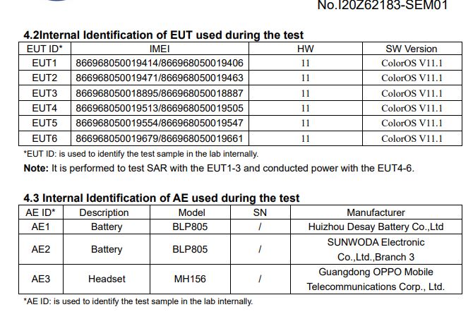 The Battery model of the Oppo CPH2197 is BLP805 manufactured under the name of Huizhou Desay battery Co LTD as used in the Oppo A53 and A73. The battery capacity of A53 is 5000 mah we can expect close to the value for Oppo CPH2195 and may arrive with 18watts fast charger. It is expected to powered by a Qualcomm Snapdragon processor.